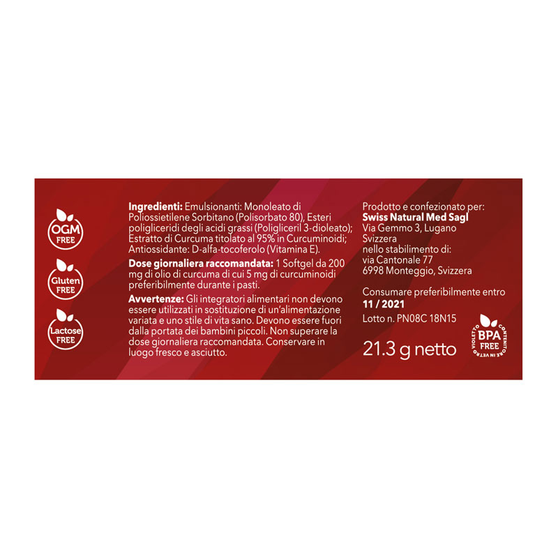 Posologia: 2 caps da 200 mg di olio di curcuma pari a 4 mg di Curcuminoidi al giorno, non superare la dose consigliata
