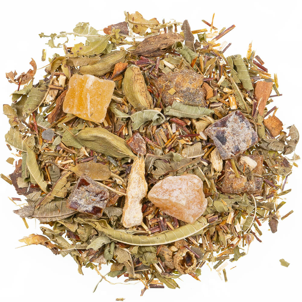 “Tropicale” con  Rooibos verde, papaya candita(zucchero), datteri, zenzero, cannella, verbena, cardamomo, aroma naturale.